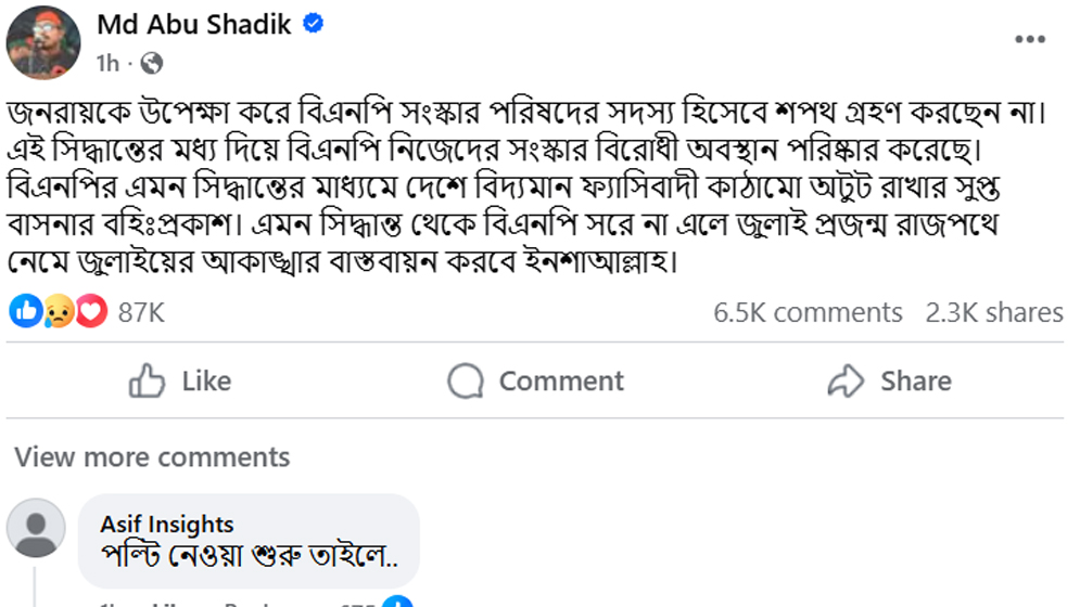 তিনি আরও লেখেন, এমন সিদ্ধান্ত দেশে বিদ্যমান কাঠামো অটুট রাখার ইঙ্গিত বহন করে। বিএনপি সিদ্ধান্ত থেকে সরে না এলে ‘জুলাই প্রজন্ম’ রাজপথে নেমে কর্মসূচি দিতে পারে।