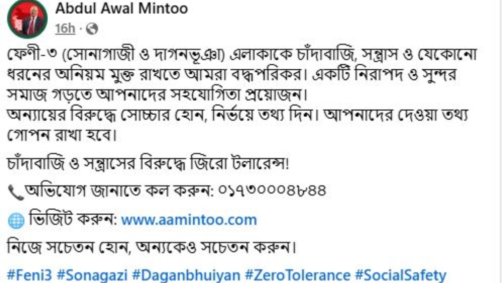 স্ট্যাটাসে মিন্টু লিখেন, ফেনী-৩ (সোনাগাজী ও দাগনভূঞা) এলাকাকে চাঁদাবাজি, সন্ত্রাস ও যে কোনো ধরনের অনিয়ম মুক্ত রাখতে আমরা বদ্ধপরিকর। একটি নিরাপদ ও সুন্দর সমাজ গড়তে আপনাদের সহযোগিতা প্রয়োজন। অন্যায়ের বিরুদ্ধে সোচ্চার হোন, নির্ভয়ে তথ্য দিন। আপনাদের দেওয়া তথ্য গোপন রাখা হবে। -699856ee7895f.jpg)