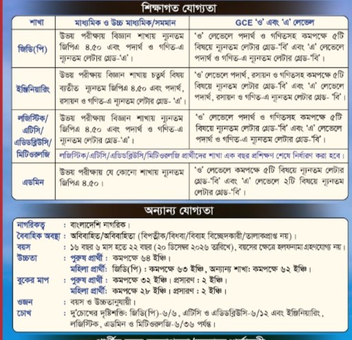 বয়স: ২০ ডিসেম্বর ২০২৬ তারিখে সাড়ে ১৬-২২ বছর। বয়স প্রমাণের ক্ষেত্রে হলফনামা গ্রহণযোগ্য নয়।